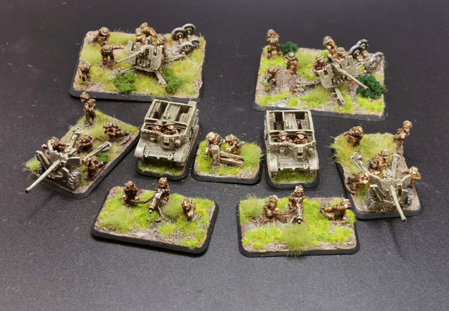 J'ai terminé des véhicules et deux 88 pour la liste allemande de ma partie de septembre. Avec le délai je n'ai pas eu le temps de peindre des deux véhicules de transport des 88mm. Les anciennes références flames of war sont de la bonne! Les véhicules AA sont de la marque skytrex.
